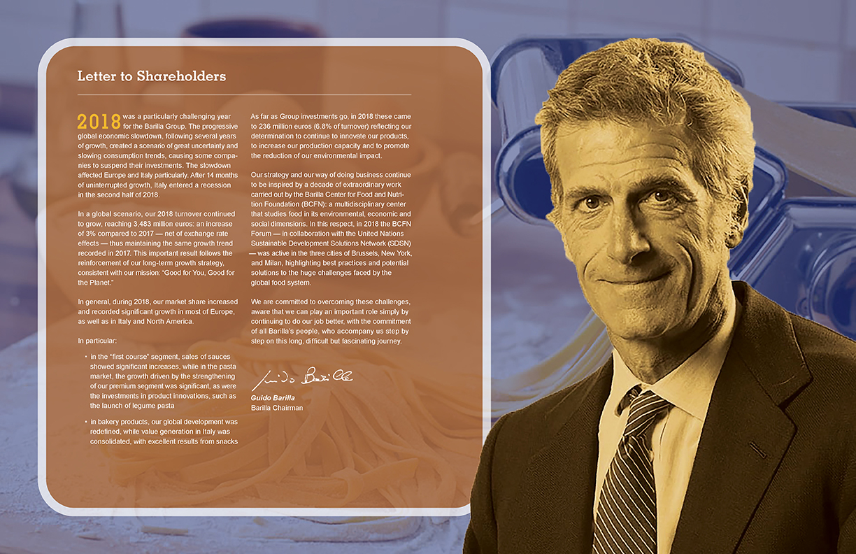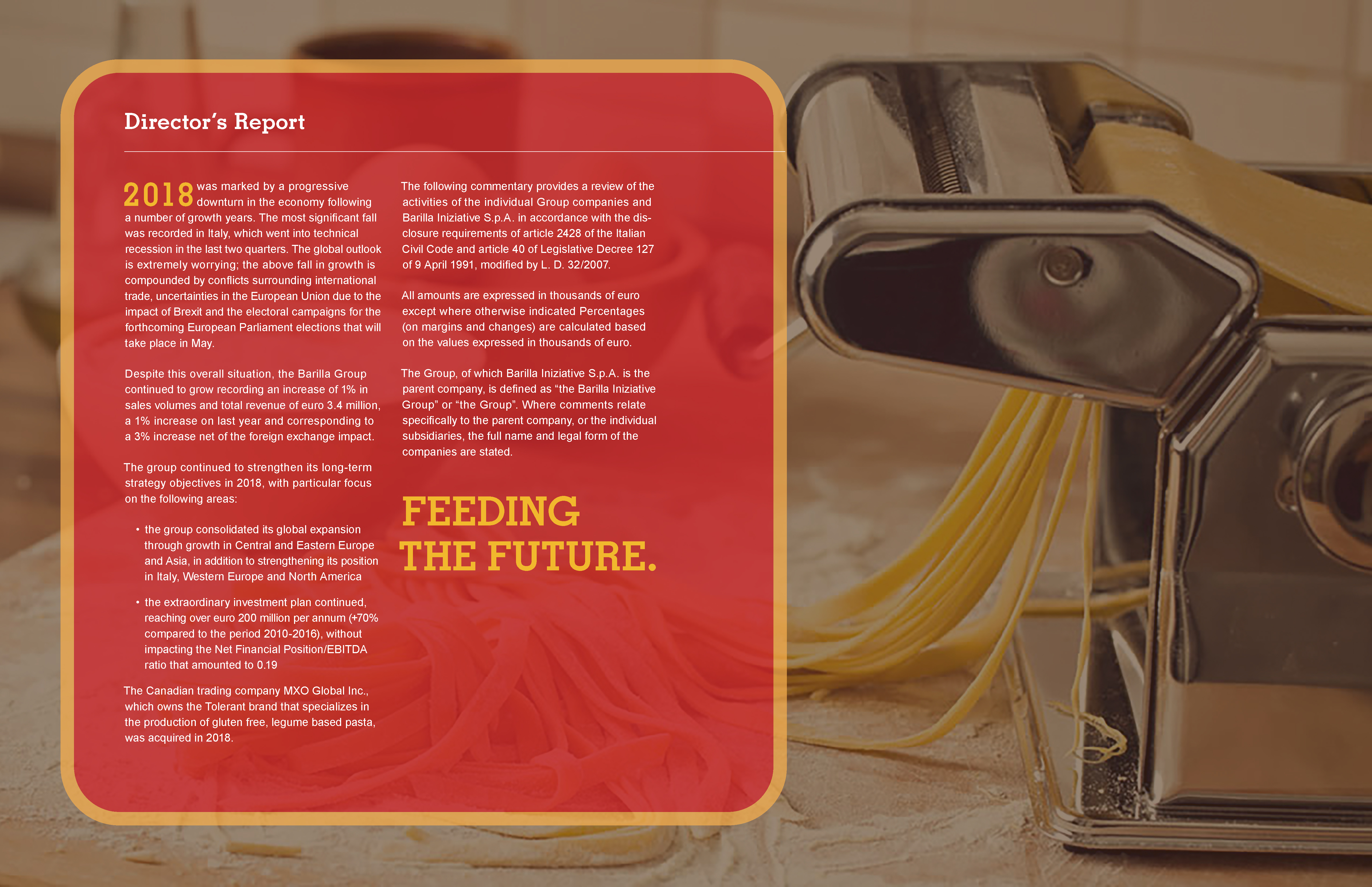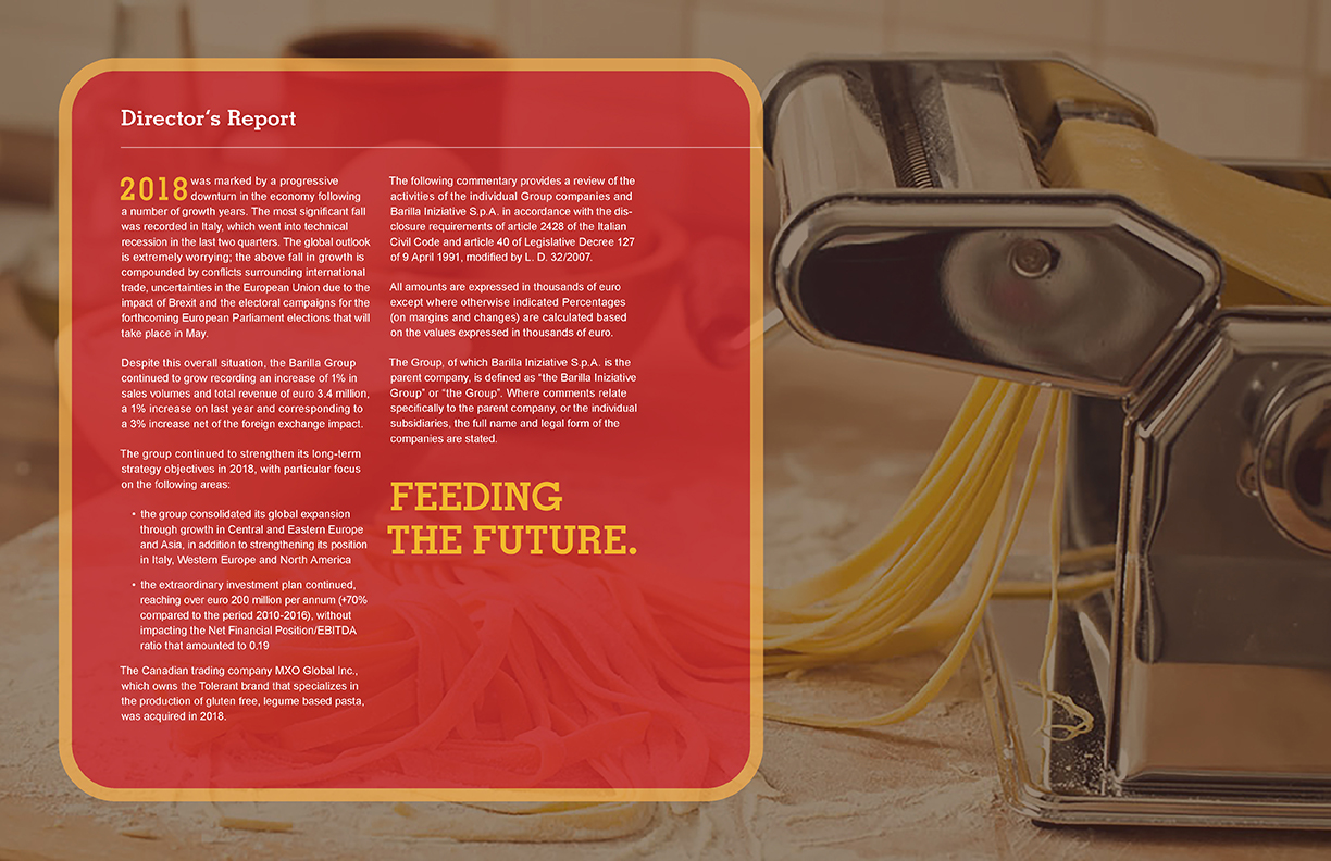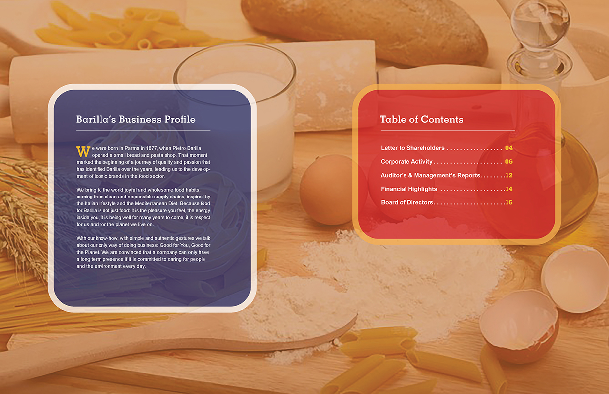 When I got access to Barilla's annual report, it was important to me to create a hierarchy and determine which information I was going to emphasize. It was also a fun challenge to produce a visual aesthetic that is true to the brand.